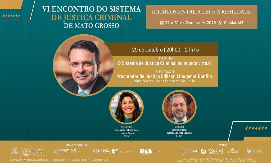 “O Sistema de Justiça Criminal no mundo virtual” será o tema da palestra inaugural do “VI Encontro do Sistema de Justiça Criminal do Estado de Mato Grosso – Ideários entre a Lei e a Realidade”, que será proferida pelo procurador de Justiça Edilson Mougenot Bonfim, do Ministério Público de São Paulo, nesta quarta-feira (29 de outubro), às 20h, no Auditório da Ordem dos Advogados do Brasil – Seccional Mato Grosso (OAB-MT).